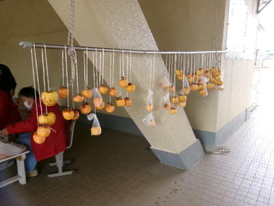 今年もこの季節がやってきました。新堀小の冬の風物詩「吊るし柿」。さあ、寒いけど素敵な季節の始まりです。