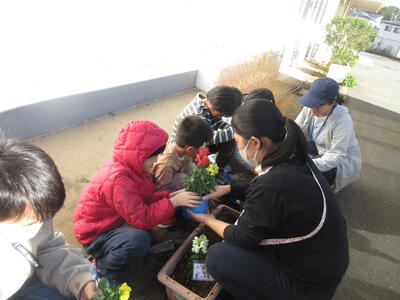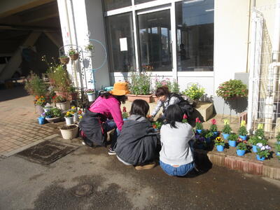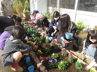 たんぽぽ学級、環境委員、楽農会こどもボランティアもかけつけて花植えが行われました。