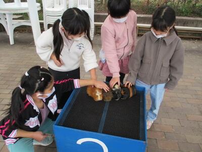 たくさんの動物の見学をした後は、お楽しみのモルモットとの触れ合いです。先生からモルモットの触れ合い方を教えてもらって始まります。