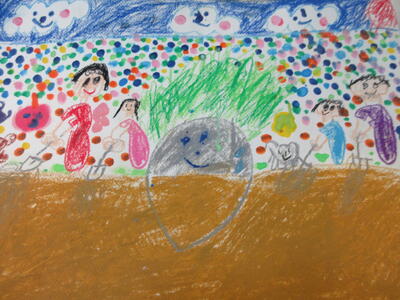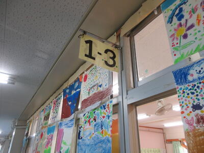 今日のスペシャルクラスは1年3組です。廊下には素敵な絵が飾ってありました。明るくのびのびした絵ですね。すばらしいです。