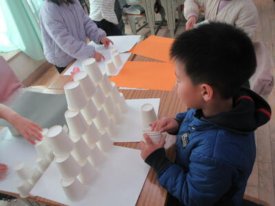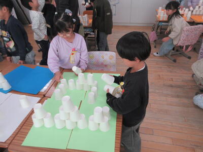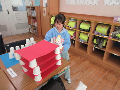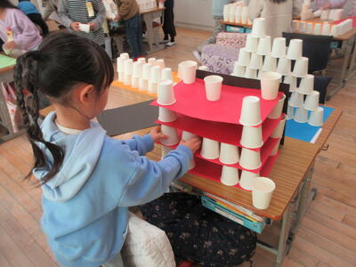 2時間目は図工です。たくさんのカップを重ね、自分だけの世界を作ります。工夫いっぱいのすてきな作品になりました。