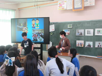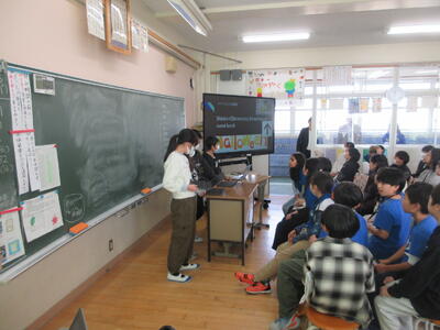 これまでに総合的な学習の時間で調べたてきたことをスライドなどにまとめ、英語とジェスチャーを交えて