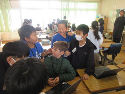 CAJとの交流で、5年生は新堀小のいいところをPRしました。