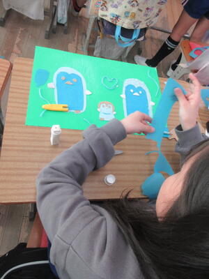 休み時間には子供図書ボランティアのみんながかけつけて、ワイワイと飾り作りをしてくれました。