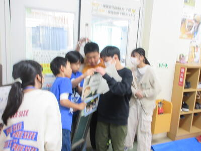 一度6年生の教室に向かい、説明の後、学校探検です。6年生が校舎内を案内し、それぞれの場所に書かれているクイズを協力して答えるというものです。6年生は英語で案内に挑戦しました。