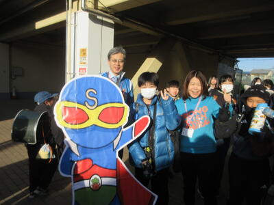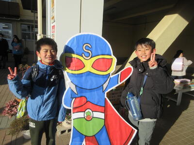 新堀小キャラクターのスマイリーも楽しくお迎えをしました。イングリッシュボランティアの保護者の方もかけつけ、オープニングスタートの様子です。