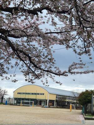 桜が残る美しい雰囲気の落ち着いた校庭の様子です。