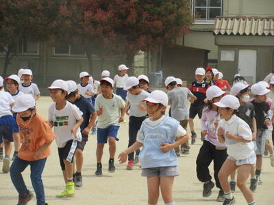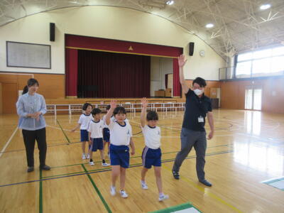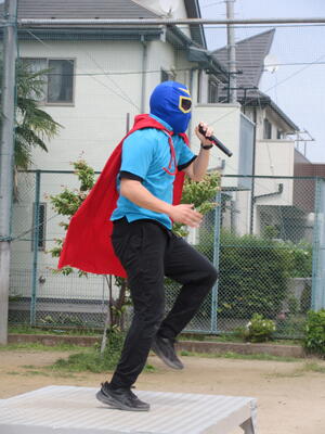 スペシャルゲストのシンボリーマンと一緒に5月の体力テストに向けて、全校児童元気に体を動かしました。