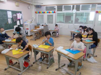 4年生はリコーダーです。曲当てクイズです。1年生からは「ちゅーりっぷ」「あたった」と楽しそうな声が上がっていました。