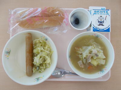 *献立 ・セルフホットドック(ウインナー・キャベツのソテ) ・ポトフ ・ミルクコーヒーゼリー ・牛乳 |