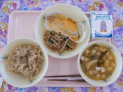 *献立 ・茶飯 ・鮭の紅葉焼き ・おかか和え ・具だくさんみそしる ・牛乳 |