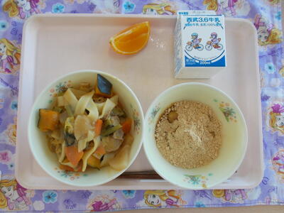 *献立 ・やさいたっぷりほうとううどん ・しんげんもち ・オレンジ ・牛乳