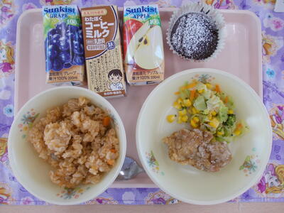 *献立 ・チキンライス ・フライドチキン ・ブロッコリーとコーンのサラダ ・チョコチップマフィン ・セレクトドリンク(コーヒー牛乳/りんごジュース/ぶどうジュース) |