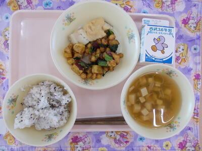 *こんだて ・ごま塩ご飯 ・さかなのゆずみそ焼き ・大豆とさつまいものごまがらめ ・すましじる ・牛乳 |