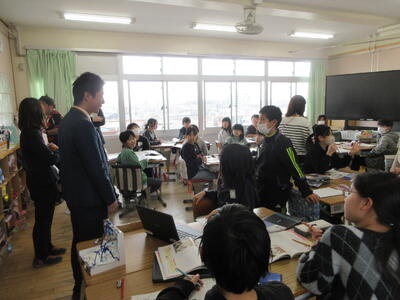夢のゲーム機を発表し合い、互いに感想や意見を言い合い、高め合った交流校の先生方です。