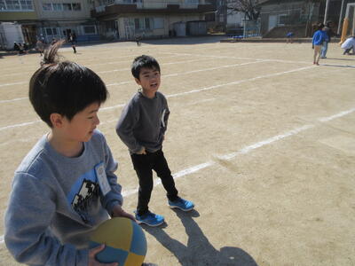 みんな真剣です。先生も本気です。たくさん遊んで、投げるのもとるのもとても上手です。