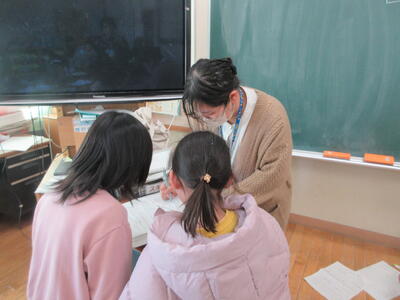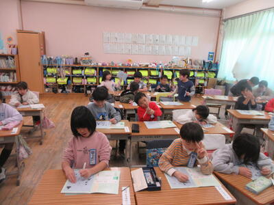 学習のルールがしっかり身に着いています。先生が順番に見て「よく書けているね」とほめています。