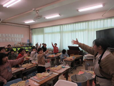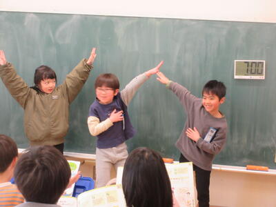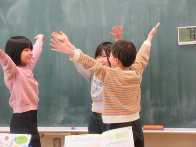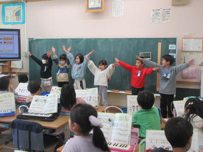 4時間目は音楽です。「とんくるりん ぱんくるりん」の歌に合わせてグループ発表会です。