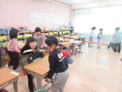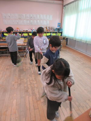 しっかり食べた後はおそうじです。ほうきやぞうきんの使い方も上手になりました。黒板もきれいに消しています。
