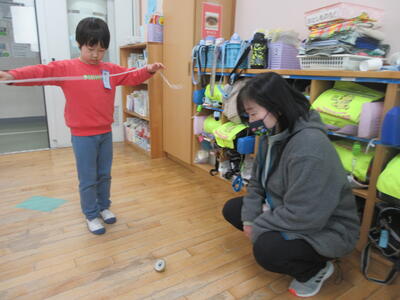 おそうじの後はお昼休み。副担任の先生がこまのコツを教えてくれます。