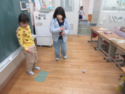 しっかりお勉強の後は20分休みです。お教室ではこまを回したり、お絵描きをしたりしています。校庭ではドッチボールが流行っています。
