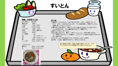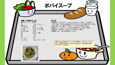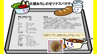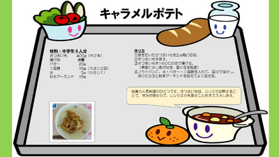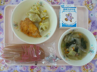*献立 ・クリームスープのスパゲッティ ・さつまいもサラダ ・牛乳 |