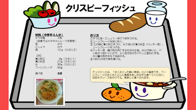 *献立 ・黒糖パン ・クリスピーフィッシュ ・コーンポテト ・野菜スープ ・牛乳 |