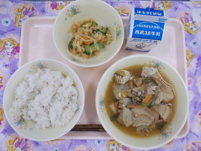 *献立 ・むぎごはん ・すきやき風煮 ・切り干し大根のハリハリ漬け ・牛乳 |