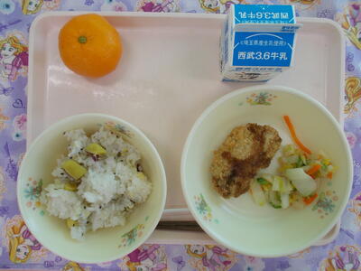 *献立 ・いもくりご飯 ・あじフライ ・白菜の即席漬け ・みかん ・牛乳 |