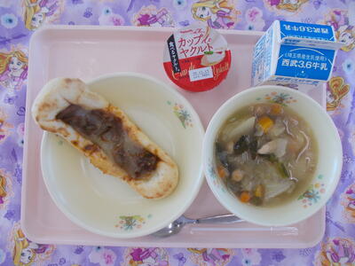 *献立 ~えほん献立~ ・ナンピザ ・ひよこ豆のスープ ・カップヤクルト ・牛乳 |
